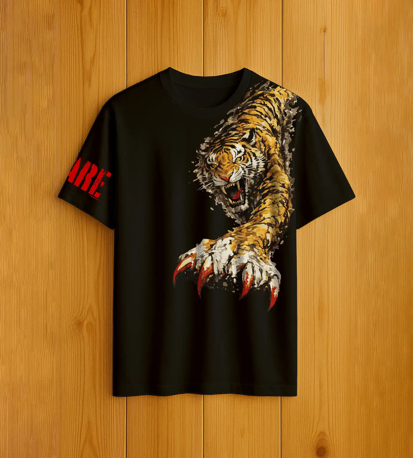 This statement BWARE oversized tee features a fierce tiger attack graphic, with razor-sharp claws breaking through the design — symbolizing aggression, confidence, and fearless energy. The high-contrast artwork stands out against the deep black fabric, while the BWARE sleeve branding adds a signature streetwear finish.